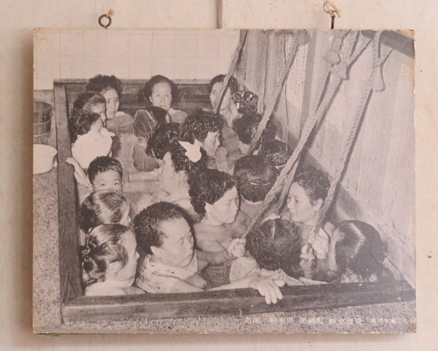 板室温泉の湯地場で、綱につかまり立ったまま入浴する独自の入浴法。一度に多くの人が入れた。胸のあたりからつま先まで水圧がかかるので末端の毛細血管まで血流が良くなる効果があったという。当時の写真を追加しました。