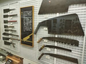 以前、仕事で陸前高田の工具店や金物店を巡回した時に、お店に飾って有る(非売品)昔の鉋や鋸、手斧など見せられて説明を受けました。