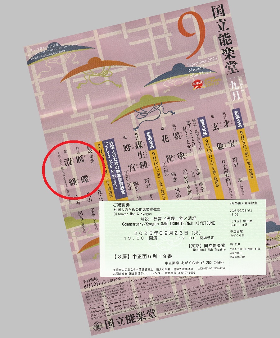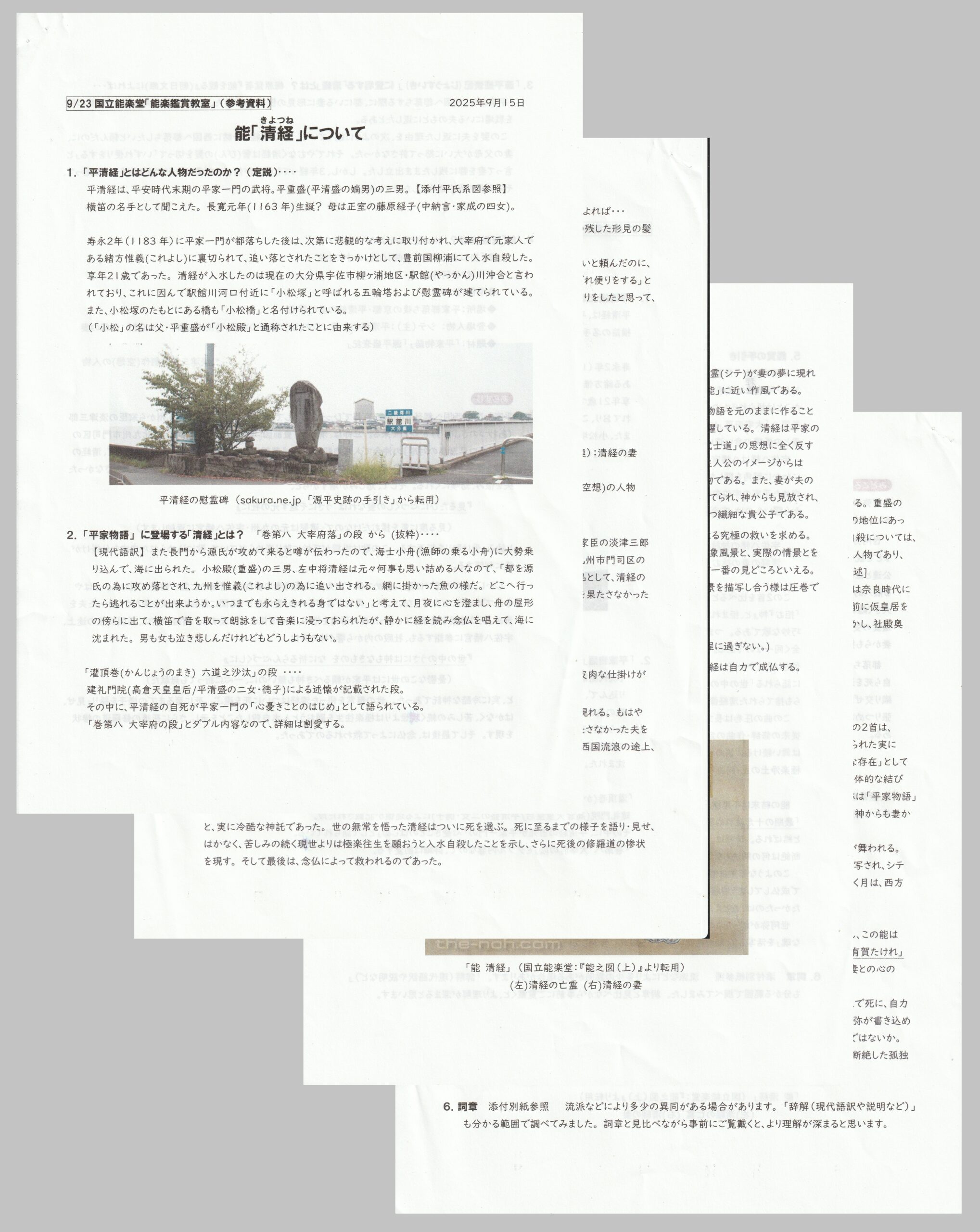 日記 2025年10月5日 能 観賞 コメントを寄せてくれる山遊亭能楽さん、砂都古さんと「国立能楽堂」へ。演目は狂言が「鴈礫(がんつぶて)」能が「清経(きよつね)」だ。能楽さんの計らいでね、なんと事前に資料を作成、地元で勉強会をやってからの観賞でした。狂言は滑稽で言葉も解り易いが、能は何を言ってるのか分からない。基礎知識と粗筋など、予習のお陰で100倍?楽しめましたよ・・・。2025/09/15 チケット 能楽堂正門 能楽堂前で 配布されたパンフ 開演前の様子(座席前のモニターで各国語が表示) 予習した資料(他にも)