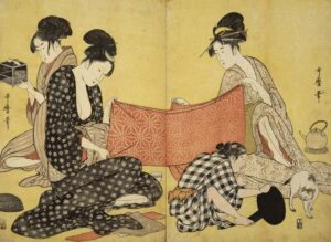 歌麿「針仕事」商家のの昼下がりの奥座敷 戯れる子ども 眉をそりお落とし地味な絣の内儀 片膝立てた年頃の女 虫籠をかざす娘