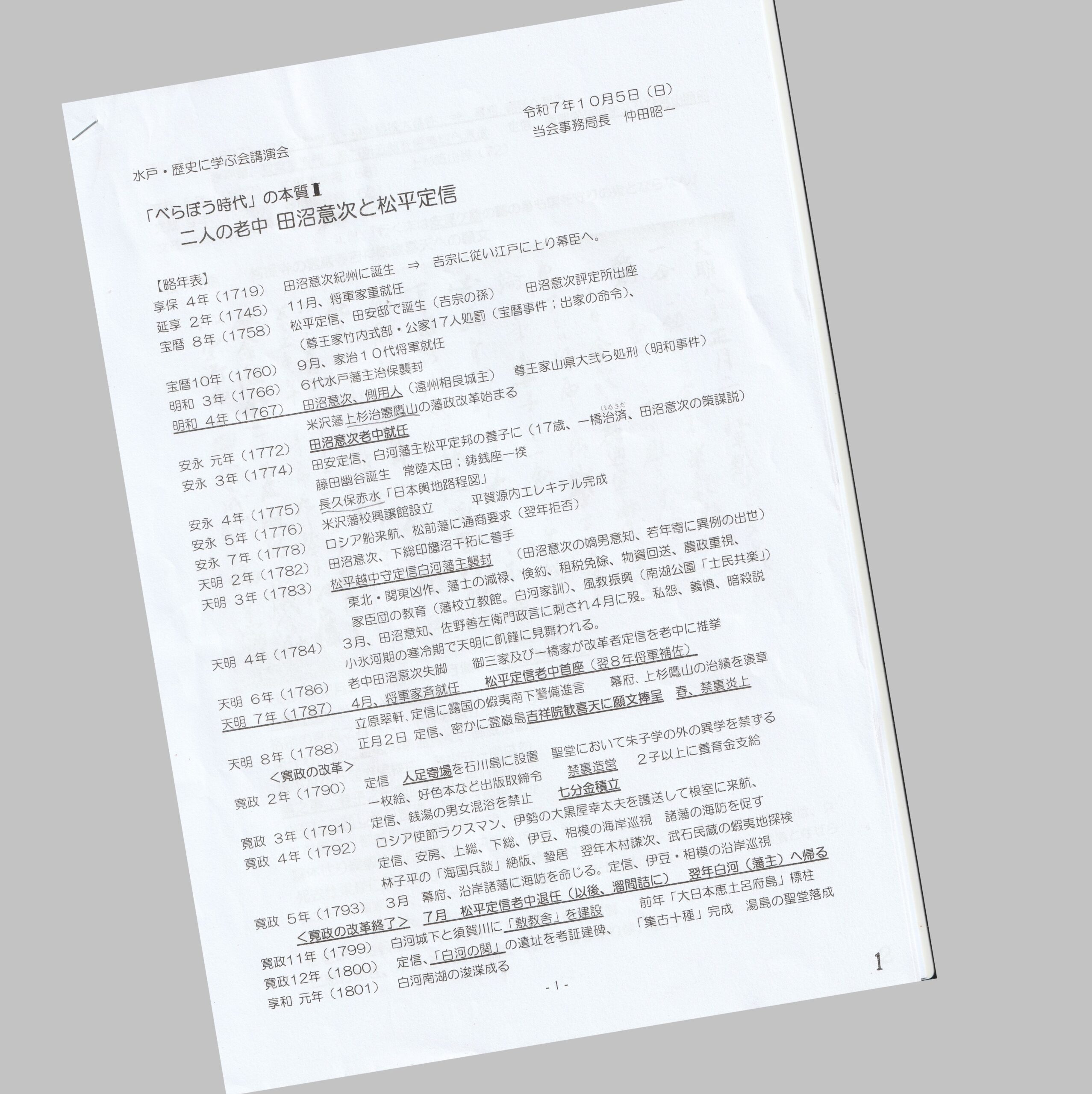 会場は「那珂市 ふれあいセンター菅谷」に変わっていた。講師は仲田昭一氏、演題は「べらぼう時代の本質Ⅱ-二人の老中 田沼意次(おきつぐ)と松平定信-だ。田沼意次は商人たちに自由な経済活動を促すことで好景気を生み出した。松平定信の寛政開拓はあまりにも締め付けが厳しく、武士から庶民に至るまで大きな反発を生む結果となった。「積極財政・好景気をもたらした経済通」と「緊縮・不況の宰相」としての通説は・・紐解いていった。2025/10/05