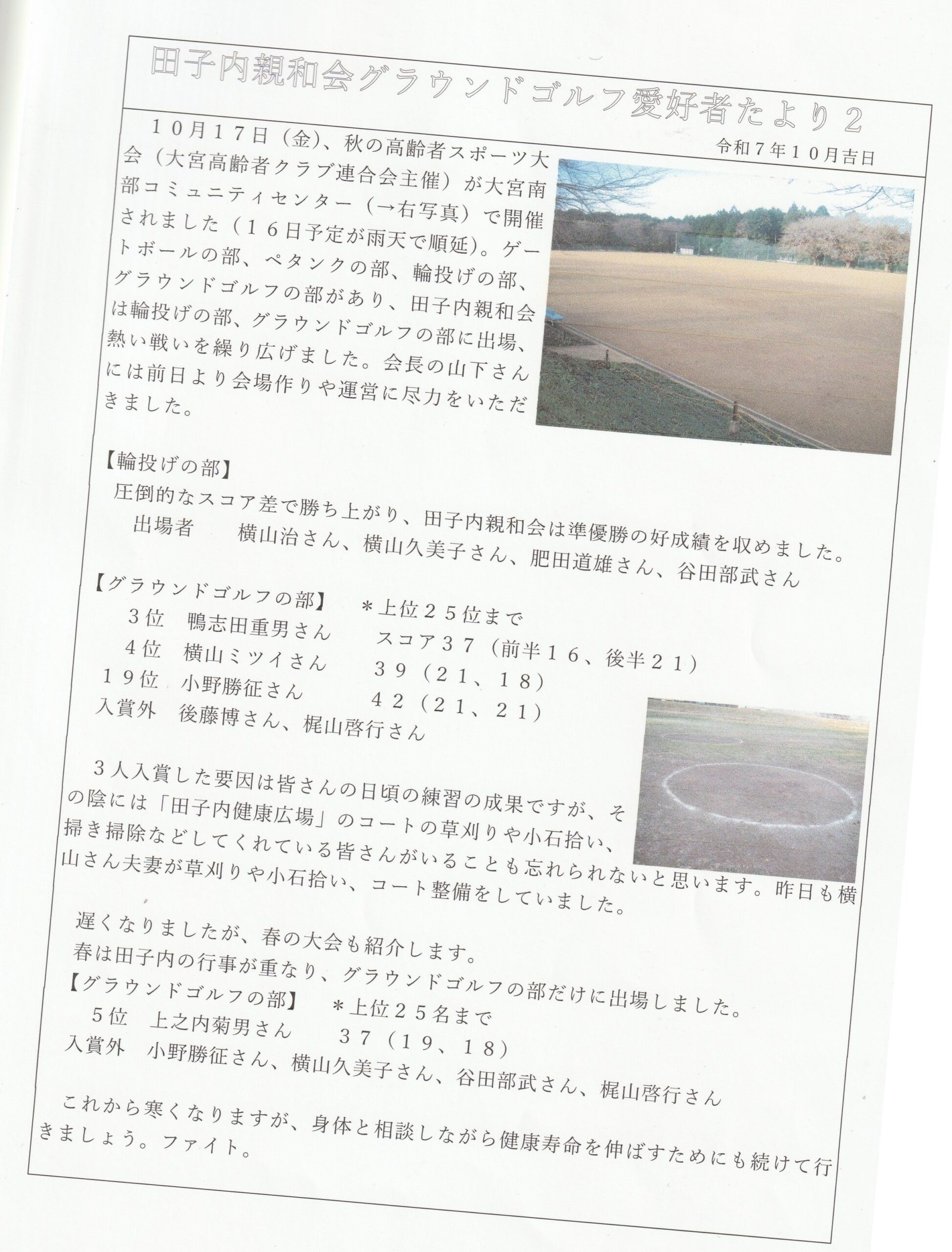日記 2025年11月10日 続くグラウンドゴルフ 田子内健康広場で行われているグラウンドゴルフは、月、水、金曜日の午前中、出欠自由でお年寄り10数人が集まる。くじ引きで2班に分かれスタートだ。草や小石が邪魔して思うようにはいかないが、それがお喋りの種になる。途中休憩もおやつを食べながら談話は続く。秋空の下、徒然なるままに吉田健康に一役か・・・。2025/11/07 黄葉しかけた樹々 荒れたグランドだが ナイスイン 休憩所で ホットコーヒーを 田子内親和会グラウンドゴルフ愛好会たより2