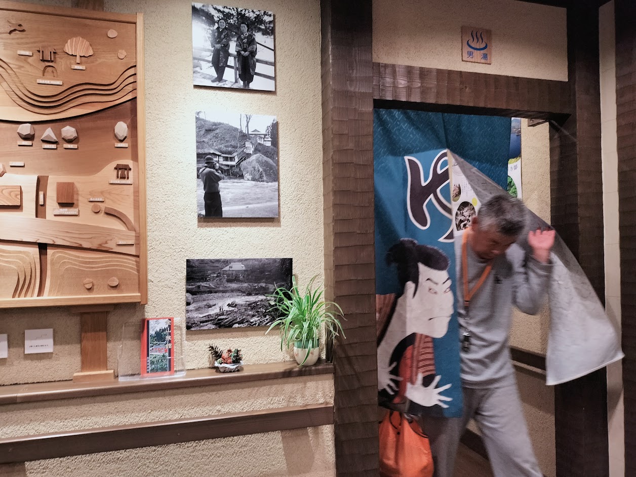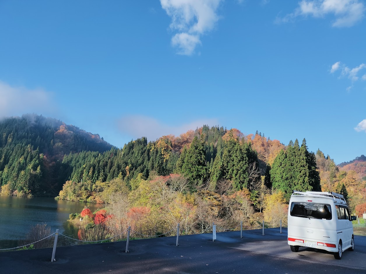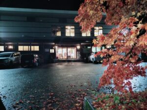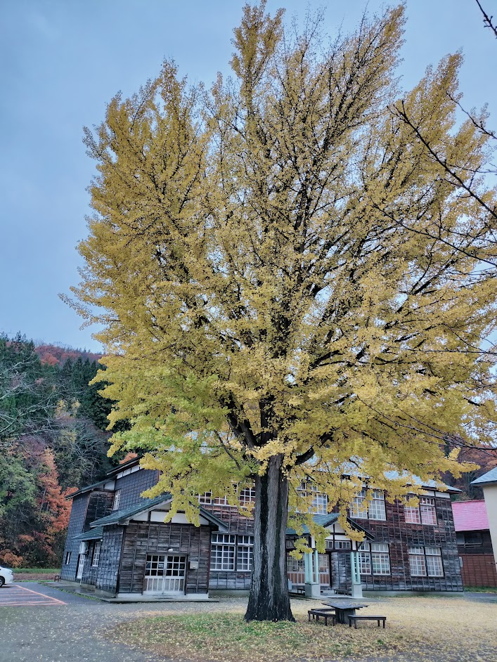 日記 2025年11月18日 昭和村を通って 実は今年2月炭酸温泉の帰り、雪の昭和村で脱輪しました。その時助けてくれた青年にお礼をしたくてね、手土産を持って訪ねたんです。喜んでくれました。陽が落ちるのは速い、再び天然炭酸温泉せせらぎ荘に着く頃は暗くなっていました。ゆっくりと温まった後、近くにある道の駅かねやまで車中泊です。外気温2℃・・・。2025/11/12 紅葉の昭和村を走って 喰丸小学校の銀杏 せせらぎ荘到着 受付(300円) 男湯 2種類の温泉 ごぼう天が旨い 翌朝の道の駅かなやま
