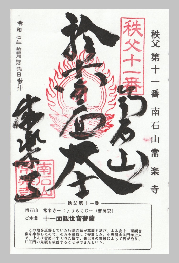川本から皆と別れて秩父に向かった。秩父三十四ヶ所札所巡りは、まだ満願に達しきれないお寺が残っているので、紅葉を満喫しながら古刹を訪ねることにしました。秩父市入口にある11番札所乗泉寺は前回来た所だ。寺と役所がトイレの管理で揉めていると聞き住職らしからぬ印象があったので御朱印もらわなかった。今回、御朱印は4時までと決まってると言われたが、何とかお願いしました。今夜の車中泊は道の駅大滝温泉へ・・・。2025/11/22