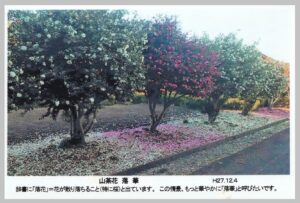 白と赤の花びら、地面にも降り積もって木々と一体感を見せた眺めは芸術的な絵になりますね~。何処でしょう?よく捉えました。