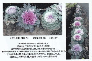 年末年始には」欠かせない葉牡丹ですが、日本には17世紀にオランダから入ってきて、江戸時代からお正月飾りとして親しまれてきたのだそうです。最初は阿蘭陀菜(オランダ菜)と呼んでいたのが、葉の形から葉牡丹になったそうです。そんなにも長い間、日本人に愛されてきたのですね。知りませんでした。花言葉も、この葉っぱに優しく包まれてみたいな・・・と思わせます。
