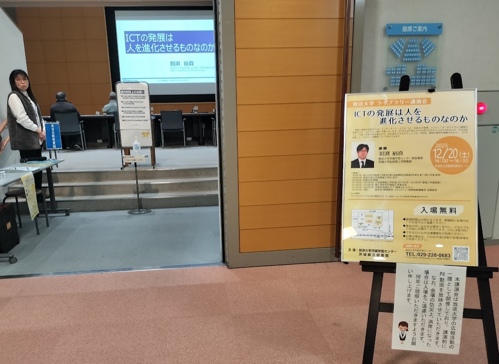 日記 2026年1月7日 ICT 放送大学ライブラリー講演会を聴いた。テーマは「情報と通信の技術(ICT)の発展は人を進化させるものなのか」ICTはもはや生活に欠かすことはできないが、それは私たち「人間」自身の何を進化させ、何を退化させたのか。通信の歴史を紐解きながら「ICTの恩恵」と「人の力」の関係を考えた。会場にはコメントをくれる山遊亭能楽さんと砂都古と一緒だった・・・。2025/12/20 茨城県立図書館 会場入口 羽淵裕真講師 館内の星乃珈琲店(講演後) 砂都古さんはバルセロナより帰国 お土産を頂く(丸太人形・ティオ他)