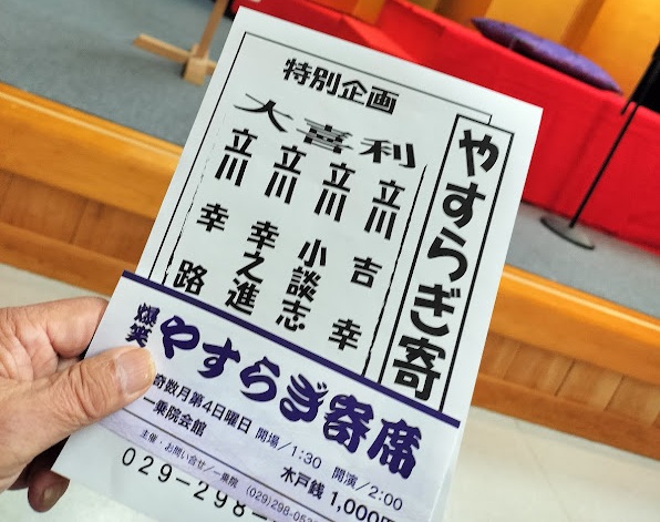 日記 2026年1月29日 やすらぎ寄席 だるま市で賑わったところ、一乗院で行われた「やすらぎ寄席」に出かけた。出演者4人が立川一門というが、初めてた見て聞く落語家だ。アットホームの雰囲気で、笑いや拍手が飛び交ってたね・・・。2026/01/25 木戸銭は1000円 昨年ユーモアのある住職が亡くなって息子に 立川小談志 立川幸路(ライオンの真似『酒を吞ませないでトラになるから』と 立川幸之進(昨年真打に) 立川吉幸 全員にお年玉を 最後に大喜利(お題は客席から)