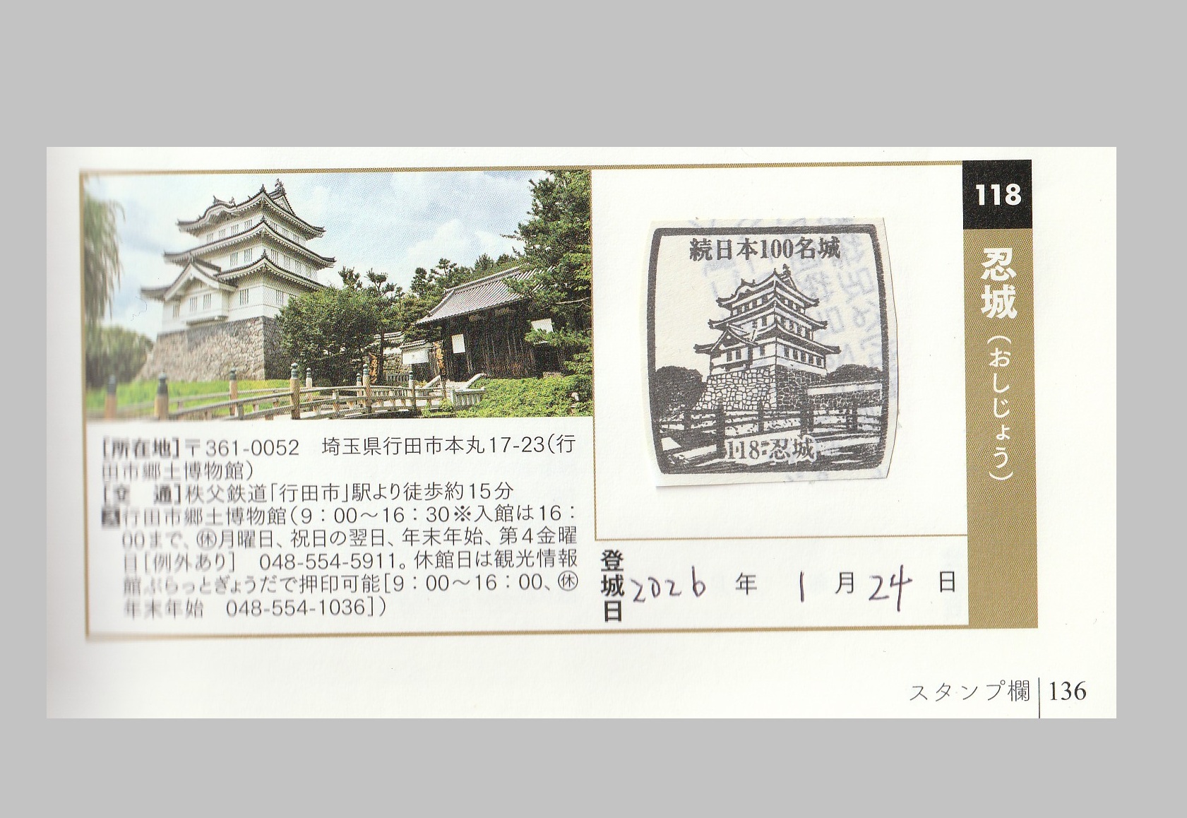 日記 2026年1月30日 忍城へ 以前、職場で一緒だった知人が行田市に住んでおり、忍城(おしじょう)を案内してもらった。豊臣軍の水攻めに耐えた難攻不落の浮き城として知られる。忍城御三階櫓は行田市郷土博物館に、最上階からは遠く上州の山並みまで一望できる。また本丸とその周辺は公園になっていた・・・。2026/01/24 東門 鐘楼 忍城 甲冑隊出陣 三階櫓展示室(足袋造りと土器) 最上階窓より 御城印 続日本100名城に押印