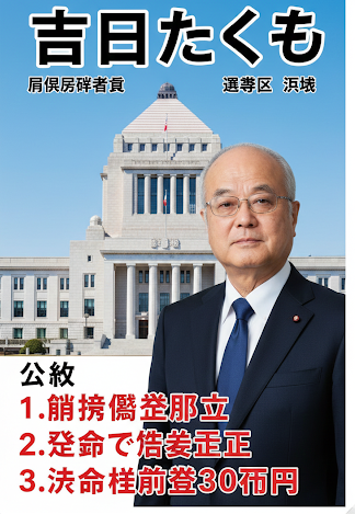 日記 2026年2月6日 選挙たけなわに 生成AIで選挙ポスターが作れるんですね。でもフェーク画像問題で文字は変えさせられてしまいました。 この度、貧民党 幹事長として大宮地区から立候補しました吉日としおです。 〔公約〕 1.消費税減税反対 2.税金で格差是正 3.資産税創設30兆円 2026/02/05 選挙ポスター 原画です