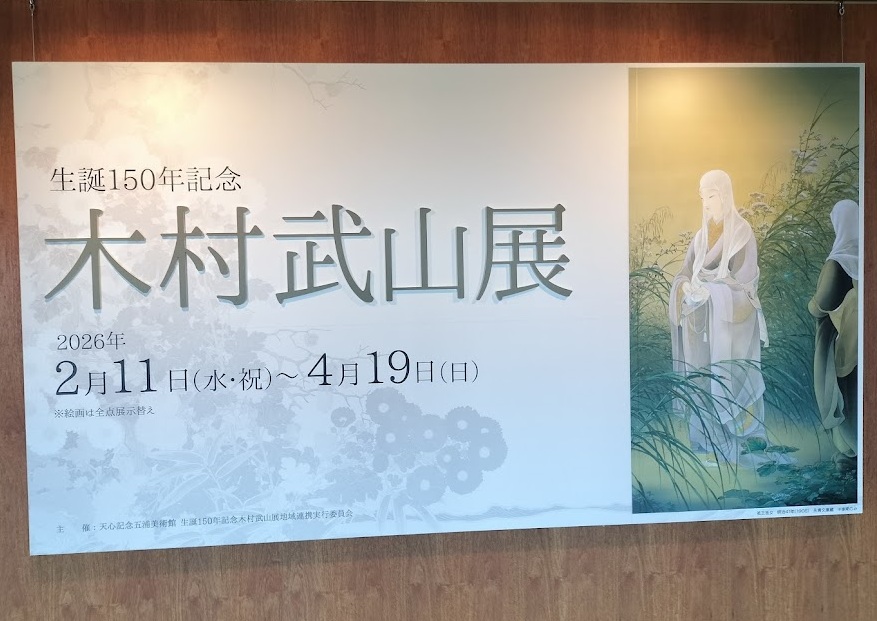 日記 2026年3月14日 木村武山展 五浦美術館での生誕150年記念「木村武山展(前期)」を観に行った。説話・物語、花鳥風月、仏画別に58作品が一堂に展示、見応えがあった。写真に収めたかったがね(×) 特別出品の大日堂は、笠間市の実家(生誕の地)へ見学に行ったことがある。再現していた。後期も行きたいな・・・。2026/03/07 五浦美術館 鴎雲広場より勿来方面 ロビーを通って 木村武山展 群鶴(其二) 群鶴(其一) カフェテリアで