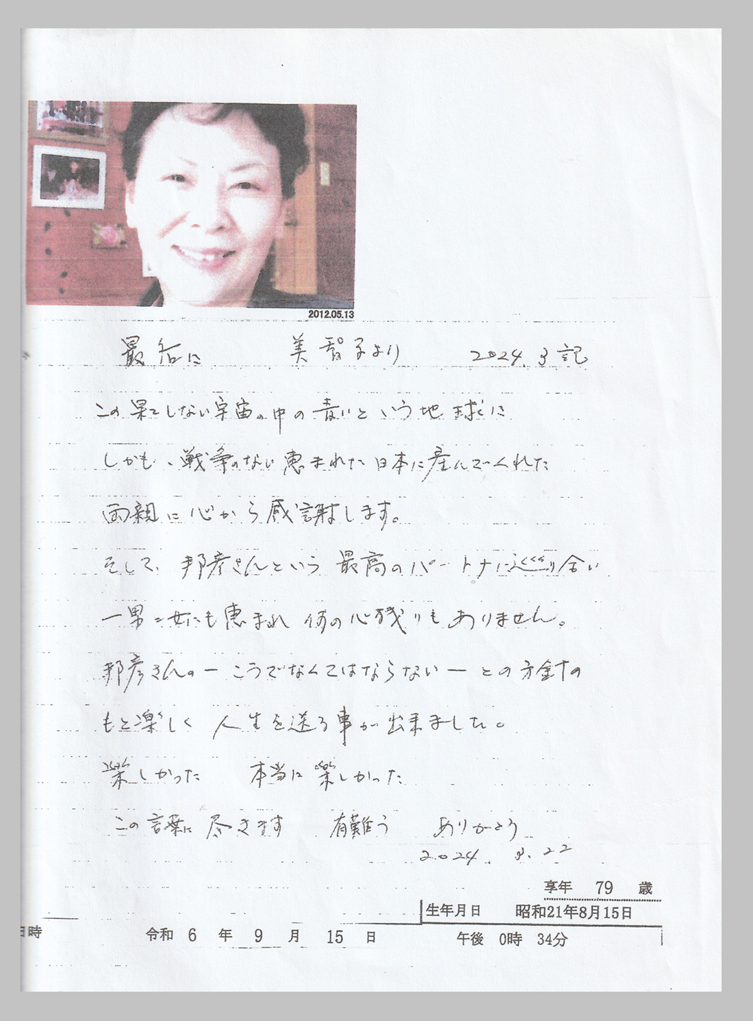 日記 2026年4月27日 書かずにはいられない リハビリ体操指導中、突然倒れて帰らぬ人になってから1年半が過ぎた。旦那さんとはご懇意で、先日、家にお邪魔したのです。なんと!遺品はまだ整理がつかないと言いながら、思い出の数々が所狭しと飾ってあった。驚いたのは亡くなるのを予期した様な6ヵ月前の手記です。優しい夫に対して愛情が滲み出ていました・・・。2026/04/24 亡くなる6ヵ月前の手記 遺品から 歌集「風のごとくに」増子美智子著 全1318首より抜粋しました 指導中にオレの目の前で倒れた(2024/09/15 10:52)