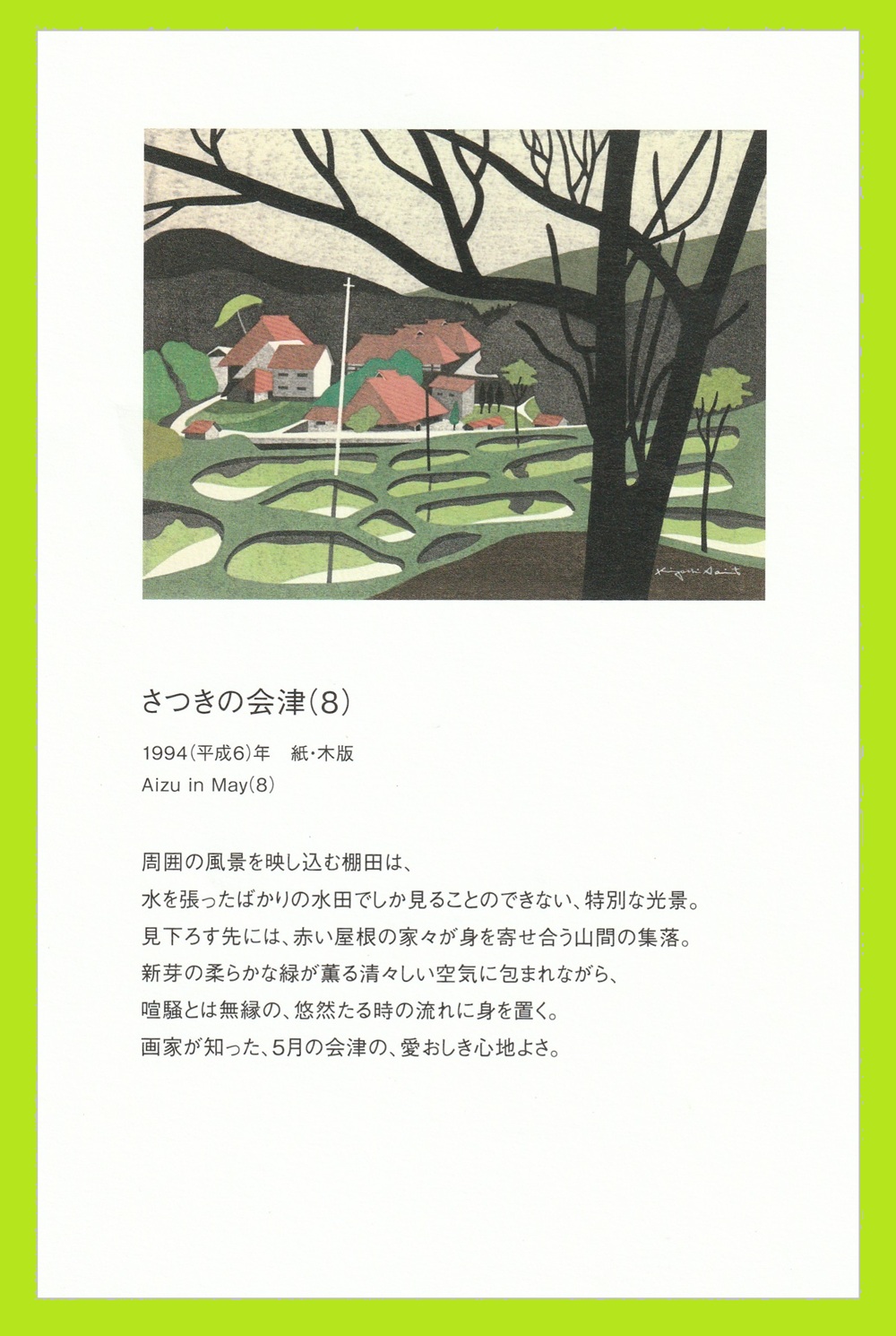 日記 2026年5月1日 奥会津の季節(Ⅲ) カレンダーはめくられ5月―6月になりました。斎藤清は福島県会津生まれの世界的な版画家です。奥会津柳津に美術館があり、只見線と只見川が醸し出す四季の移ろいは見る人を惹きつけます・・・。(写真は奥会津・只見線カレンダー撮影 星 賢孝)2026/05/01 5月―6月 さつきの会津(8) 蓋沼俯瞰(根岸~西方) 六十里超トンネルと浅草岳(大白川~只見) 第八只見川橋梁と蒲生岳(只見~蒲生) 美里の菜の花と飯豊山(根岸~会津高田)